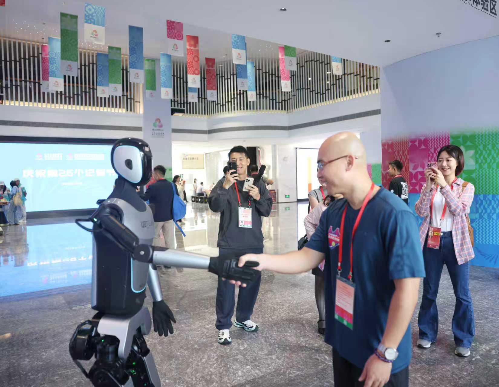 参会记者在媒体中心与机器人互动 南方+记者 段奇 摄