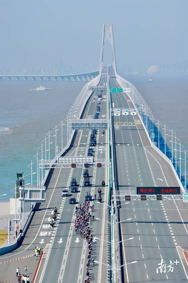 公路自行车赛男子个人赛,大部队返程抵达港珠澳大桥白海豚人工岛。
